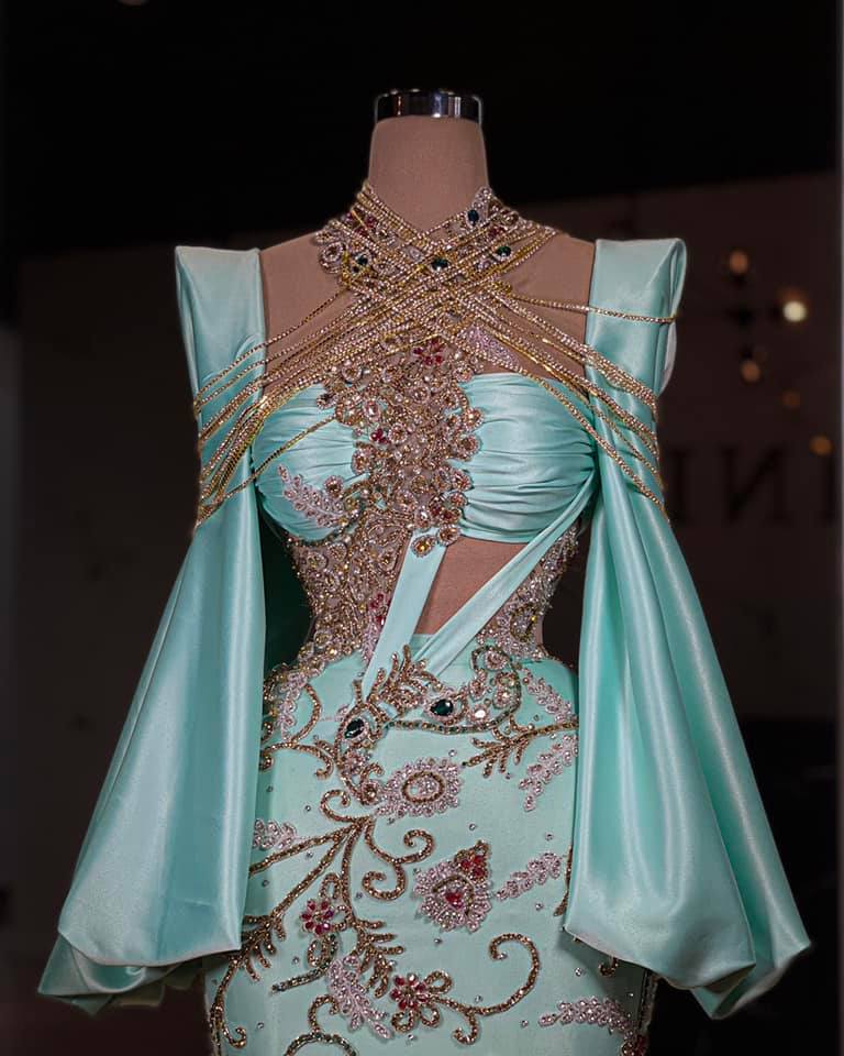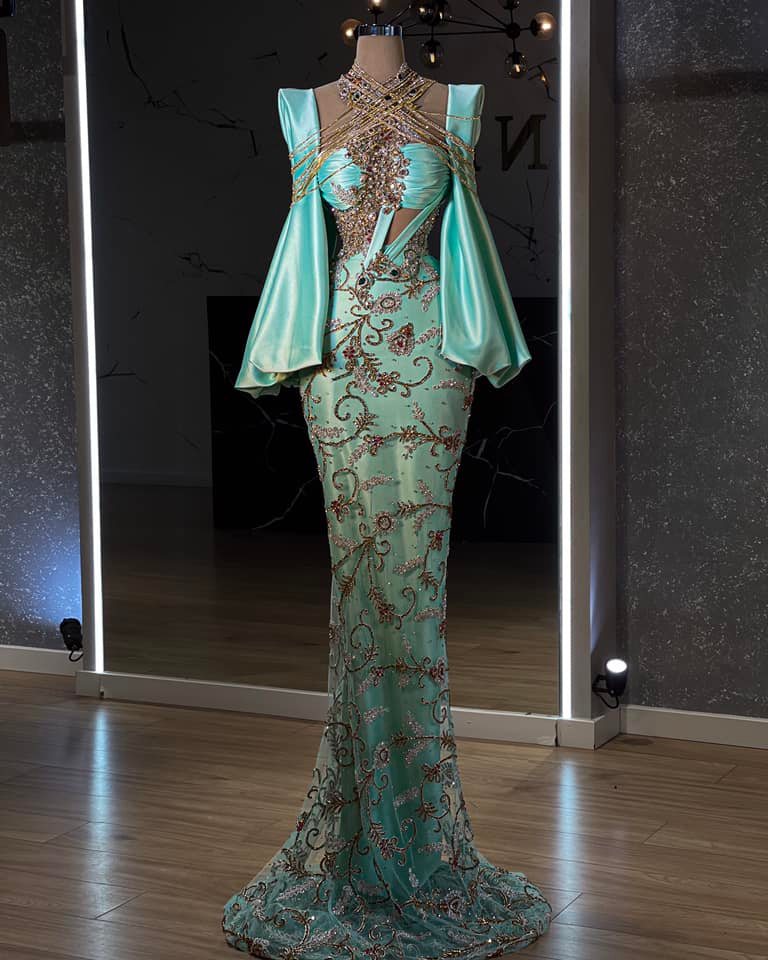 Dieses graue Kleid in Maxilänge ist ein raffiniertes und stilvolles Stück, das mit Sicherheit alle Blicke auf sich ziehen wird. Die langen Ärmel und der Maxi-Schnitt sind sowohl schick als auch elegant und eignen sich für jeden formellen Anlass. Das Kleid ist mit funkelnden Steinen verziert, die dem Gesamtdesign einen Hauch von Glamour und Glanz verleihen. Die Kombination aus dem glatten grauen Stoff und den Ziersteinen schafft einen raffinierten und auffälligen Look. Egal, ob Sie an einer Hochzeit oder einem Abendgarderobe teilnehmen, dieses Maxikleid mit langen Ärmeln und Steinen gibt Ihnen ein selbstbewusstes und stilvolles Gefühl.