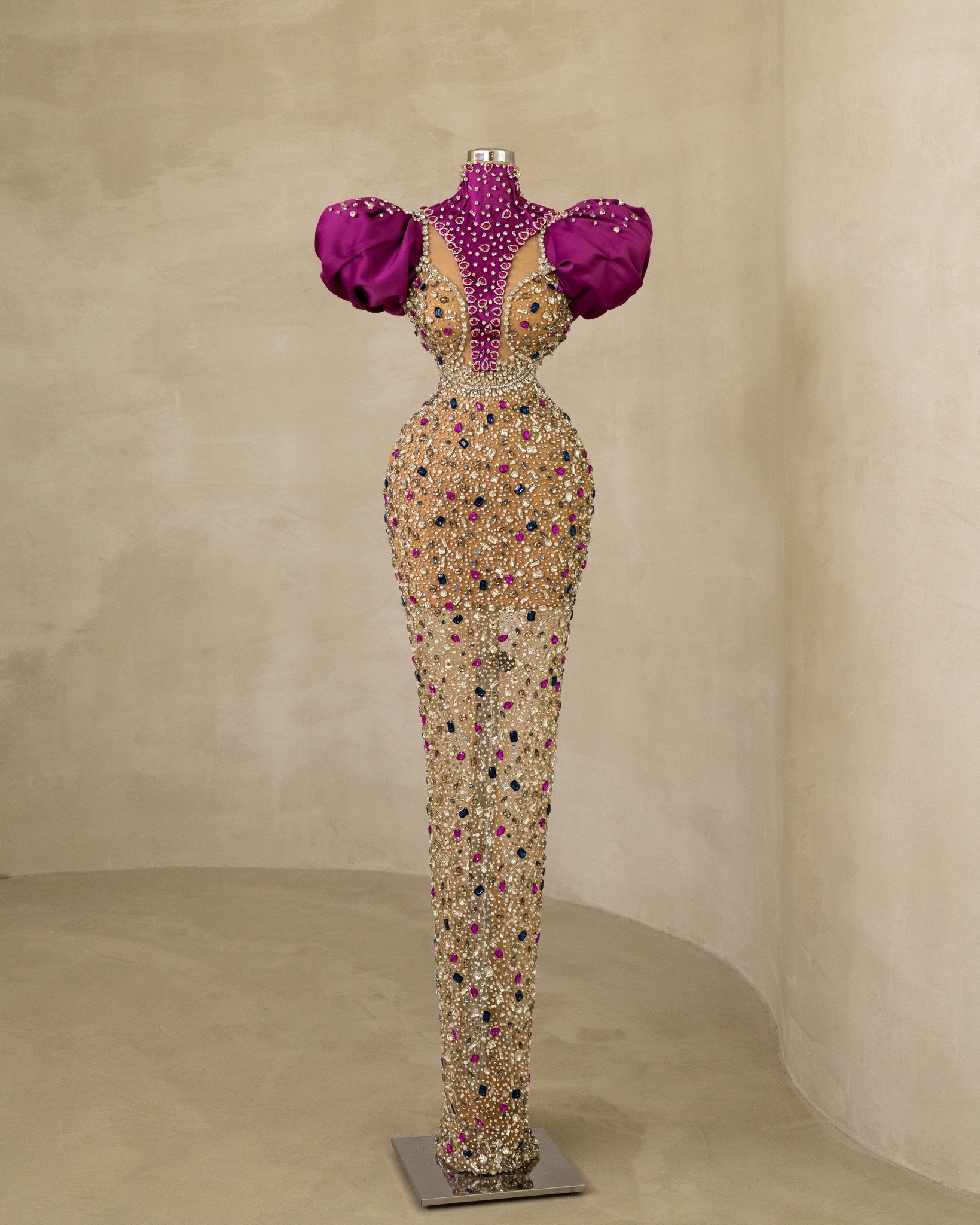 In this Puff Sleeve Dress Embellished with Stones, every element harmonizes to create a masterpiece that's both captivating and daring. Whether gracing a gala, a soirée, or an upscale celebration, you embody a vision of elegance that's hard to forget—an epitome of luxury and finesse that resonates with both tradition and modernity.
