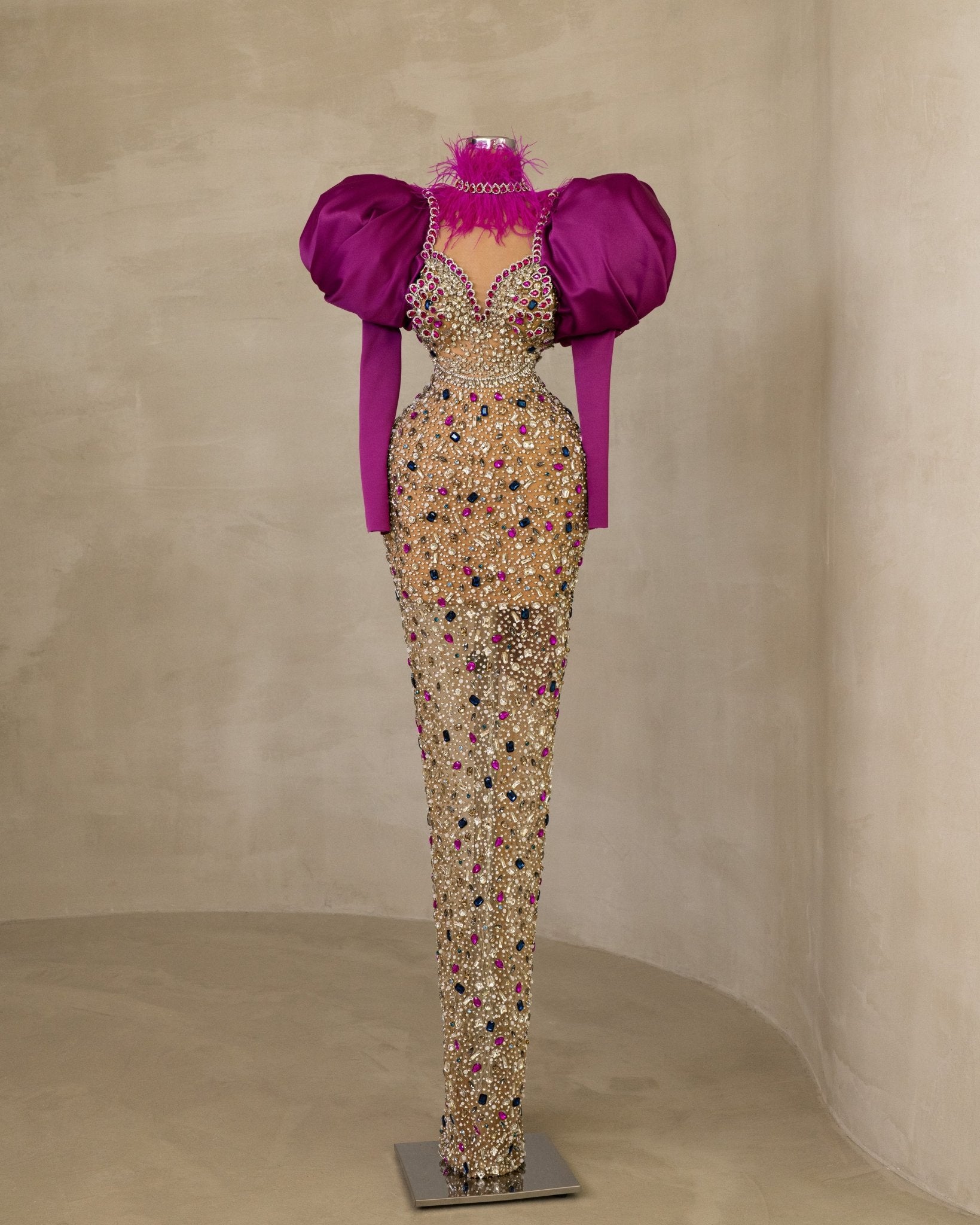 Whispering tales of glamour and luxury, this High Neck Puff Sleeve Dress Embellished with Stones is the epitome of refined beauty. Whether gracing a gala, a soirée, or a formal celebration, it effortlessly embodies elegance and extravagance. It's a dance of lace, stones, satin, and feathers, meticulously orchestrated to make you the focal point of admiration and adoration.