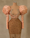 A celebration of artistry and craftsmanship, this Puff Sleeve Dress Embellished with Stones is a statement of individuality and poise. With each step, the dress comes alive, resonating with your inner radiance and commanding attention. Whether gracing a gala or a special evening event, this melon-colored masterpiece stands as a testament to your unique style and innate elegance, ensuring you leave an indelible mark on every heart and memory.
