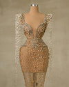 The entire dress is adorned with crystals and pearls, creating a symphony of light and elegance. This exquisite embellishment transforms you into a walking masterpiece, radiating opulence and sophistication.