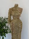 Dieses atemberaubende hochgeschlossene Kleid ist mit funkelnden Pailletten verziert, die bei jeder Bewegung das Licht einfangen. Die Pailletten verleihen dem Gesamtdesign einen Hauch von Glamour und machen es zur perfekten Wahl für jeden besonderen Anlass. Das Kleid besteht aus einem luxuriösen Stoff, der wunderschön fällt, mit einer schmeichelnden Silhouette, die jeder Figur schmeichelt. Der hohe Ausschnitt ist sowohl elegant als auch raffiniert, während der tiefe Schlitz einen Hauch von Reiz hinzufügt. Egal, ob Sie an einer Hochzeit, einem Abschlussball oder einer formellen Veranstaltung teilnehmen, dieses Kleid wird mit Sicherheit alle Blicke auf sich ziehen und Ihnen das Gefühl geben, eine wahre Königin zu sein.