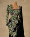 Moreover as you step into the spotlight, all eyes will be on you, drawn by the regal allure and captivating embellishments. The emerald green hue adds an extra layer of charm. Additionally the luxurious velvet fabric embraces your body, providing style and comfort. The meticulous placement of stones and flowers creates a symphony of shimmer and elegance.