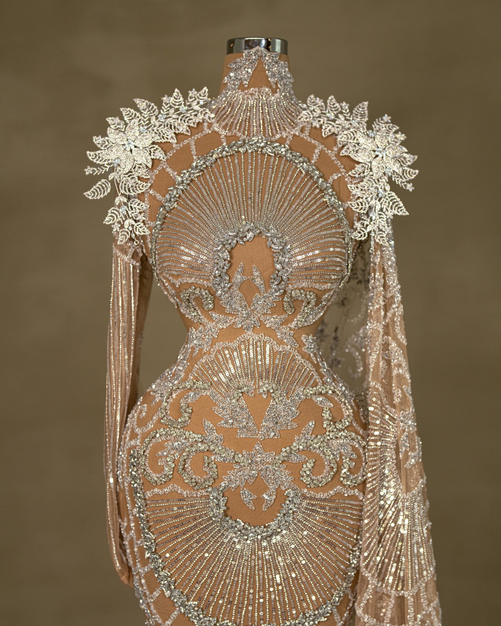 Dieses graue Kleid in Maxilänge ist ein raffiniertes und stilvolles Stück, das mit Sicherheit alle Blicke auf sich ziehen wird. Die langen Ärmel und der Maxi-Schnitt sind sowohl schick als auch elegant und eignen sich für jeden formellen Anlass. Das Kleid ist mit funkelnden Steinen verziert, die dem Gesamtdesign einen Hauch von Glamour und Glanz verleihen. Die Kombination aus dem glatten grauen Stoff und den Ziersteinen schafft einen raffinierten und auffälligen Look. Egal, ob Sie an einer Hochzeit oder einem Abendgarderobe teilnehmen, dieses Maxikleid mit langen Ärmeln und Steinen gibt Ihnen ein selbstbewusstes und stilvolles Gefühl.
