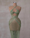 Immerse yourself in the enchanting allure of nature with our Sleeveless Dress with Twist Neckline. Crafted from a delicate light green mesh material, this dress is a celebration of elegance and grace, featuring intricate design elements that captivate the senses.