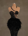 Indulge in the epitome of glamour with this stunning long Black Dress that seamlessly combines opulence and allure. Crafted from a luxurious black sequins fabric, the dress captivates with its shimmering texture, creating a mesmerizing play of light as you move. Additionally, the opulent detailing extends to the hem, where lavish black feathers add a touch of sophistication, creating a striking contrast against the dark sequins.