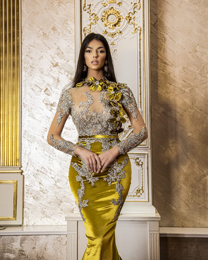 Dieses umwerfende lange Samtkleid ist sicher ein Statement bei jedem formellen Event oder besonderen Anlass. Der sattgelbe Samtstoff ist weich und luxuriös und bildet den perfekten Hintergrund für die auffälligen Steine, die das Kleid schmücken. Diese Steine fangen das Licht wunderschön ein und verleihen dem Gesamtlook einen Hauch von Glamour und Glanz. Egal, ob Sie dieses Kleid zu einem Abschlussball, einer Hochzeit oder einem Abendgarderobe tragen, es wird mit Sicherheit alle Blicke auf sich ziehen und Sie werden sich wie eine Königin fühlen. Die Kombination aus Samt und auffälligen Steinen schafft einen Look, der sowohl elegant als auch im Trend ist, was es zu einer vielseitigen Wahl für jede modebewusste Frau macht. Kombinieren Sie dieses Kleid mit Absätzen und funkelnden Juwelen, um den Look zu vervollständigen.