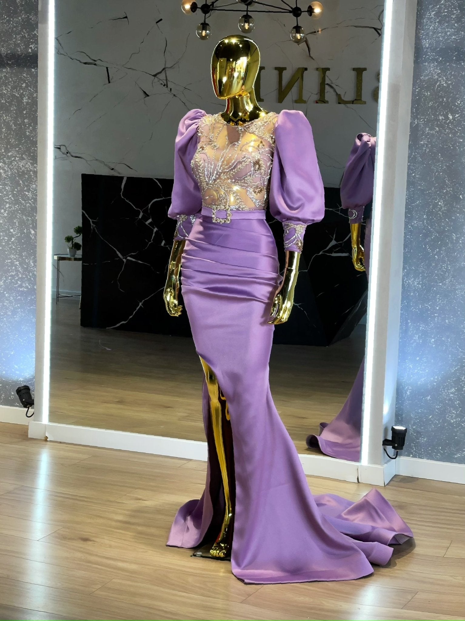 Setzen Sie ein Statement in diesem atemberaubenden langen Satinkleid in einem sanften Hellviolett. Der luxuriöse Satinstoff umschmeichelt Ihre Kurven an den richtigen Stellen und kreiert eine schmeichelhafte Silhouette. Die Puffärmel fügen einen Hauch von Drama und Weiblichkeit hinzu, während die funkelnden Steine, die das Kleid verzieren, einen Hauch von Glamour und Eleganz verleihen. Der tiefe Schlitz fügt einen Hauch von Sexiness und Anziehungskraft hinzu und macht dieses Kleid perfekt für einen besonderen Anlass oder einen Abend in der Stadt. Kombinieren Sie es mit schlichten Absätzen und minimalen Accessoires für einen schicken und raffinierten Look oder kleiden Sie es mit Statement-Schmuck und auffälligen Schuhen für ein auffälliges Ensemble. Egal, wie Sie es stylen, dieses Satinkleid mit Puffärmeln, Steinen und einem tiefen Schlitz wird mit Sicherheit alle Blicke auf sich ziehen und einen bleibenden Eindruck hinterlassen. Der hellviolette Farbton ist feminin und zart, während die Steinverzierungen einen Hauch von Glamour und Raffinesse hinzufügen. Die Puffärmel und der tiefe Schlitz fügen einen Hauch von Verspieltheit und Sexiness hinzu und machen dieses Kleid perfekt für jeden Anlass, bei dem Sie sich selbstbewusst und schön fühlen möchten. Egal, ob Sie an einer formellen Veranstaltung teilnehmen oder einfach nur für eine Nacht in der Stadt unterwegs sind, dieses lange Satinkleid wird mit Sicherheit zu einem Favoriten in Ihrer Garderobe.
