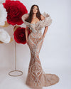 The meticulously placed 3D leaf details on the shoulder provide an unexpected and enchanting twist to the classic off-shoulder silhouette, making this dress a true work of art. Whether you're attending a gala, wedding, or any special occasion, this dress promises to deliver elegance, style, and sophistication.