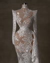 The high neckline exudes regal grace, framing the neckline with refined poise while offering a hint of modesty. Long sleeves cascade gracefully, bestowing an air of sophistication and grace upon the bride. A deep slit adds a daring element to the design, infusing the gown with a subtle sensuality that is both alluring and tasteful.