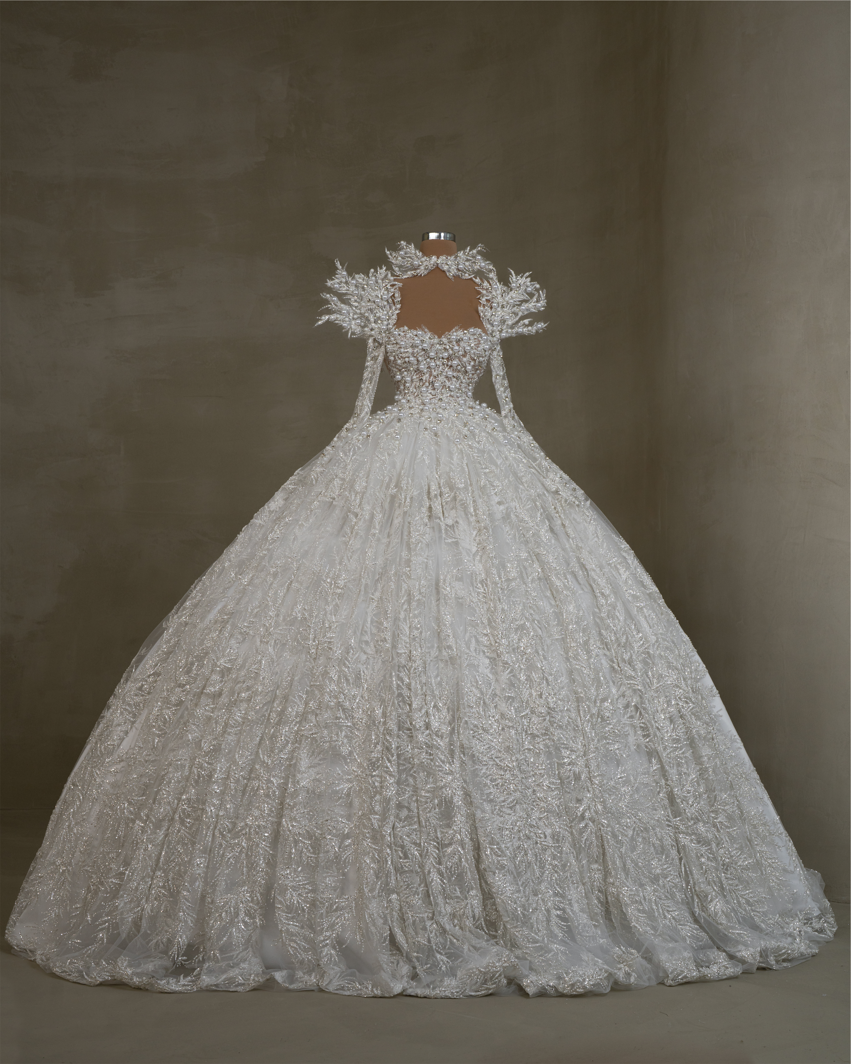 The intricate neckline of this bridal gown is a true masterpiece. With its elaborate design, it frames your face and adds a captivating focal point to the ensemble. The attention to detail in the neckline showcases the craftsmanship and artistry that goes into every stitch.