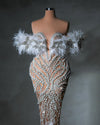 The dress is adorned with a dazzling array of crystals and pearls, meticulously placed to create a radiant sparkle that catches the light with every movement. The off-shoulder neckline is further enhanced with delicate floral motifs, crafted from sparkling crystals and soft white feathers. These elements combine to create a design that is both opulent and ethereal.