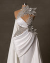 The bodice of the Bridal Dress is a masterpiece of opulent embellishments, adorned with a delicate interplay of crystals and pearls. Furthermore, a singular crystal flower enhances the intricate detailing, providing a subtle yet captivating focal point.