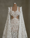 This bridal dress is designed to make you feel like a true goddess on your special day. The combination of the majestic pearl-embellished cape, minimalist waist-cut design, and stunning intricate pearl detailing come together harmoniously to create a look that is both ethereal and captivating.