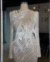 This long dress is a truly breathtaking piece that combines the elegance of sparkle lace with the delicacy of feather detailing. The dress features long sleeves that add a touch of elegance and sophistication to the dress. The lace is covered with sparkles that catch the light beautifully and add a touch of glamour to the dress. The feathers are used as embellishments adding a touch of delicacy and femininity to the dress. The dress is cut in a flattering silhouette that will flatter any figure and the long length of the dress creates a classic and timeless look. The dress is also made with high-quality fabric that feels soft and comfortable to wear, ensuring that you look and feel your best all night long. The combination of the sparkle lace, the feather details, and the perfect cut, makes this dress a perfect choice for any special event or evening out.