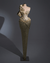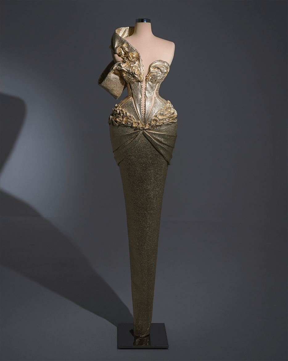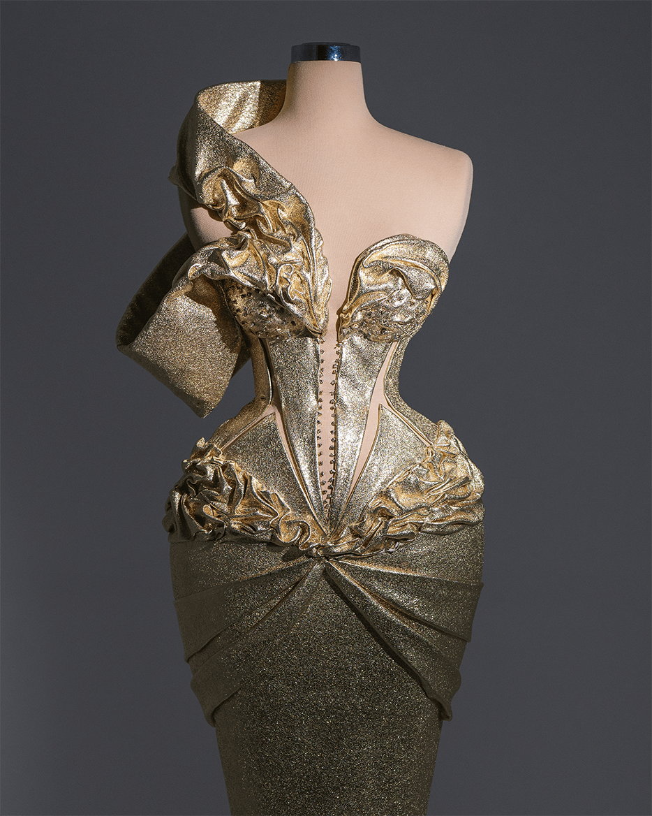 Discover the perfect blend of elegance and glamour with this gold long haute couture dress featuring sparkling gemstones and luxurious metallic leather fabric, designed to make a statement at any special occasion.