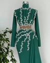 This stunning green dress is the perfect blend of sophistication and elegance. The high neck and side tail add a touch of glamour to the overall design, making it perfect for any formal occasion. The dress is made from a luxurious fabric that drapes beautifully, with a flattering silhouette that will flatter any figure. The vibrant green color is sure to make a statement, while the high neck and side tail add a touch of drama. Whether you're attending a wedding, prom, or black tie event, this dress is sure to turn heads and make you feel like a true princess.
