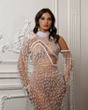 Step into the world of luxury in this breathtaking long dress with a high neck and long sleeves. The deep cut in the chest adds a touch of sexiness, while the high neck and long sleeves provide a sense of sophistication and elegance. The dress is made entirely of pearls, creating a stunning and shimmering effect that is sure to turn heads. The pearls are carefully arranged to create a beautiful and intricate design that is both elegant and timeless. Perfect for a special occasion or a black-tie event, this dress is sure to make you feel confident and beautiful. The high neck, long sleeves, and deep cut in the chest create a unique and unforgettable look, while the pearls add a touch of luxury and glamour. This is a must-have for anyone looking to make a lasting impression.