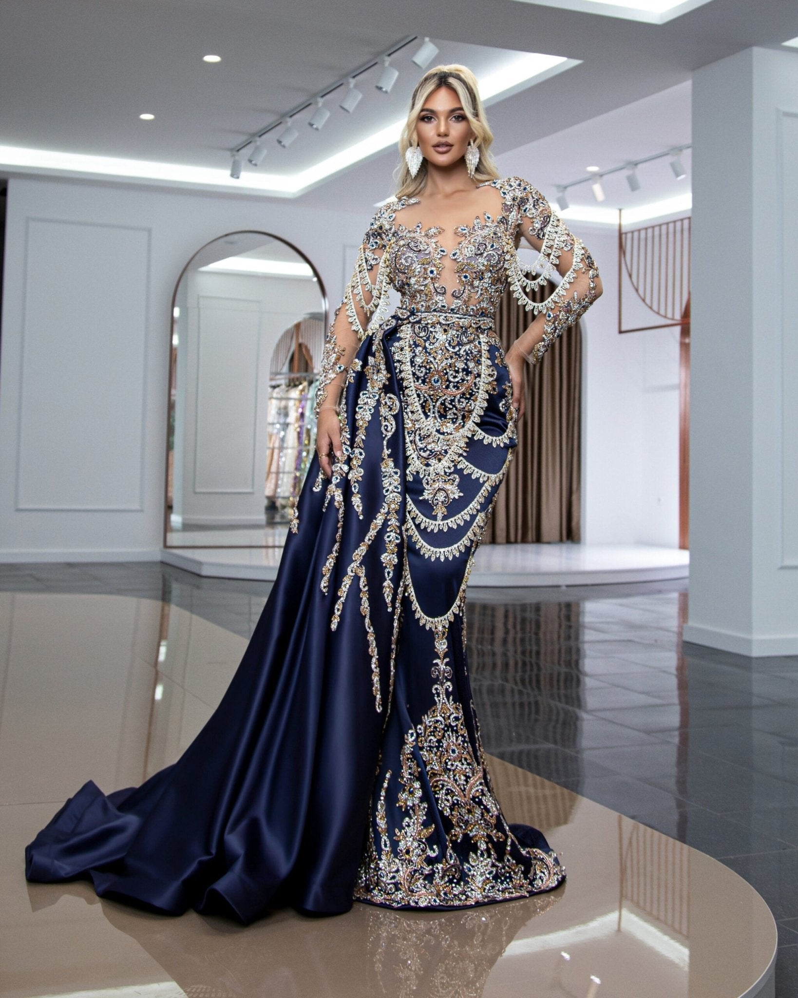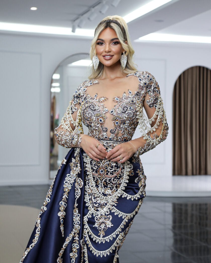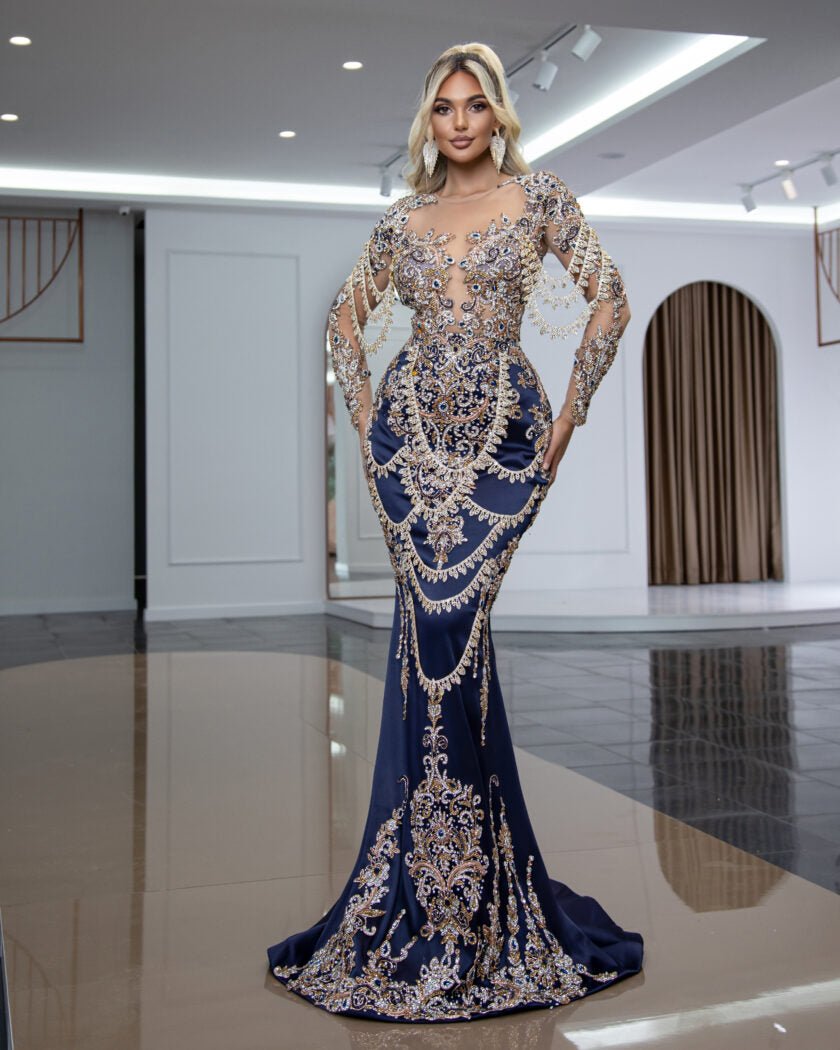 This breathtaking dress is made from a luxurious fabric that drapes beautifully and flatters the figure. The dress features a sleek and elegant design, with a long, flowing silhouette that is both elegant and alluring. The dress is also adorned with sparkling stones that catch the light with every movement, adding a touch of glamour and sophistication. From the delicate beading on the bodice to the intricate stone embellishments on the skirt, every inch of this dress is a work of art. Perfect for a formal event or special occasion, this sparkling stone-encrusted long dress is sure to make you feel like a true queen.