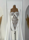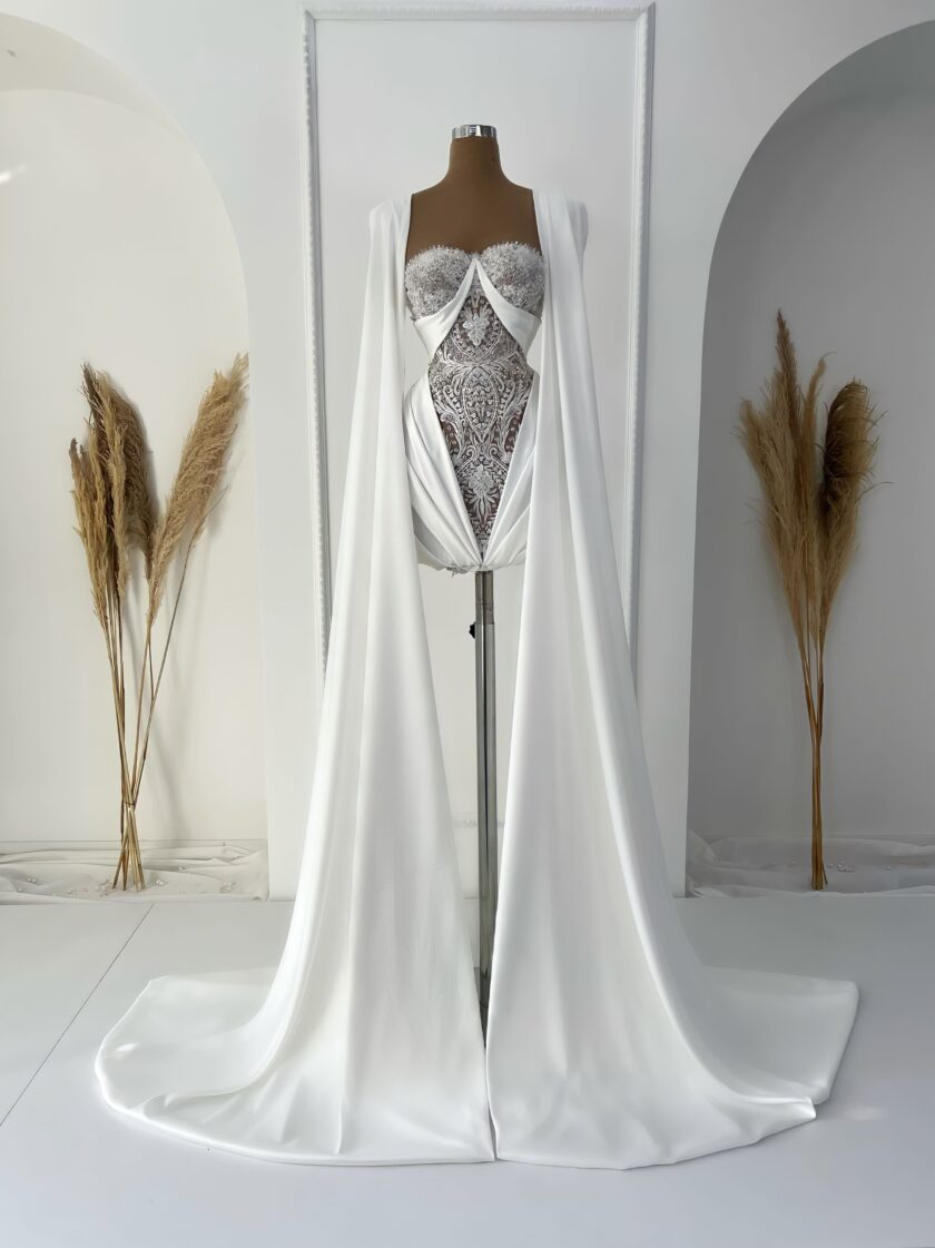 This eye-catching short dress is perfect for the bride-to-be who wants to make a statement on her big day. The dress is adorned with flashy crystals and features a long, flowing side cape that adds a touch of drama and movement to the overall look. The short length of the dress is perfect for showing off your legs, and the crystals add a touch of sparkle and glamour. The dress is made from a lightweight and comfortable fabric. Whether you're walking down the aisle or dancing the night away, this crystal-encrusted and side cape-adorned dress is sure to make you feel like a true queen on your special day.