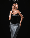 Flowing seamlessly from the waist, the gown transitions into a shimmering silver floor-length skirt that catches the light with every movement. The metallic fabric delivers a subtle sparkle, making this piece ideal for formal events, red carpet moments, or luxury evening occasions. Its figure-hugging cut elongates the body, enhancing natural curves while maintaining an air of effortless elegance.