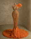 Step into the realm of pure radiance and enchantment with our breathtaking Dress Embellished with Stones and Feathers in a mesmerizing shade of vibrant orange. This exquisitely designed garment embodies elegance, sophistication, and a touch of alluring allure.