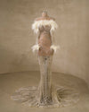 Introducing a breathtaking masterpiece of elegance and luxury, behold the mesmerizing allure of this High Neck Dress Embellished with Feathers and Stones. Every detail has been meticulously crafted to create an exquisite ensemble that will captivate all who lay eyes upon it.