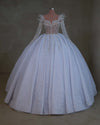 With an emphasis on graceful allure, this gown boasts long sleeves that envelop the bride's arms with a delicate embrace. The sleeves are adorned with a magnificent lace, resplendent with shimmering sparkles and sequins. The interplay of light on this embellished lace creates a mesmerizing spectacle, casting a spellbinding aura around the bride.