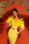 Préparez-vous à scintiller et à briller dans notre superbe robe à plumes et sequins à épaules dénudées en jaune vif. Cette pièce élégante et accrocheuse présente un décolleté flatteur à épaules dénudées, des plumes délicates et des paillettes scintillantes qui vous feront tourner les têtes à tout événement. La silhouette ajustée et l'ourlet séduisant rendent cette robe parfaite pour une soirée, un bal ou un mariage. Fabriquée à partir d'un tissu de haute qualité et confortable, cette robe deviendra à coup sûr un incontournable de votre garde-robe. Démarquez-vous avec style avec notre robe jaune à plumes et sequins à épaules dénudées.