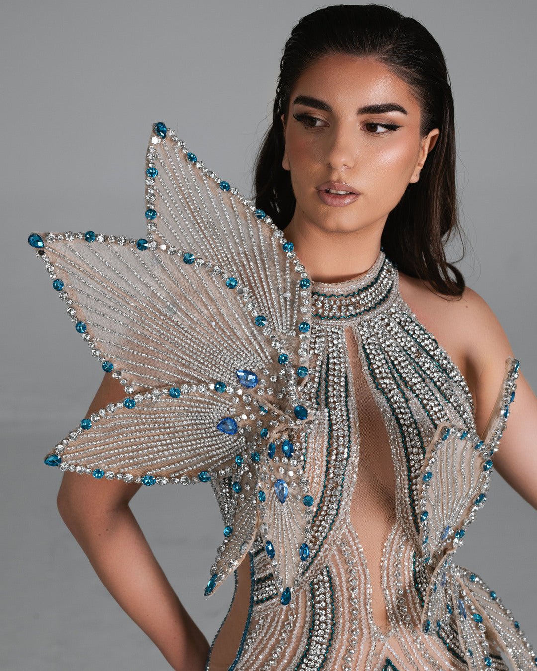 The Gressie Long Dress with Petal Design is a breathtaking masterpiece that exudes elegance and sophistication. This form-fitting gown is meticulously crafted with intricate beadwork and shimmering crystal embellishments, creating a dazzling effect that captures the light beautifully. The standout feature of this dress is its unique petal-inspired design on the shoulder, adding a bold and artistic touch to the overall look.