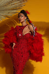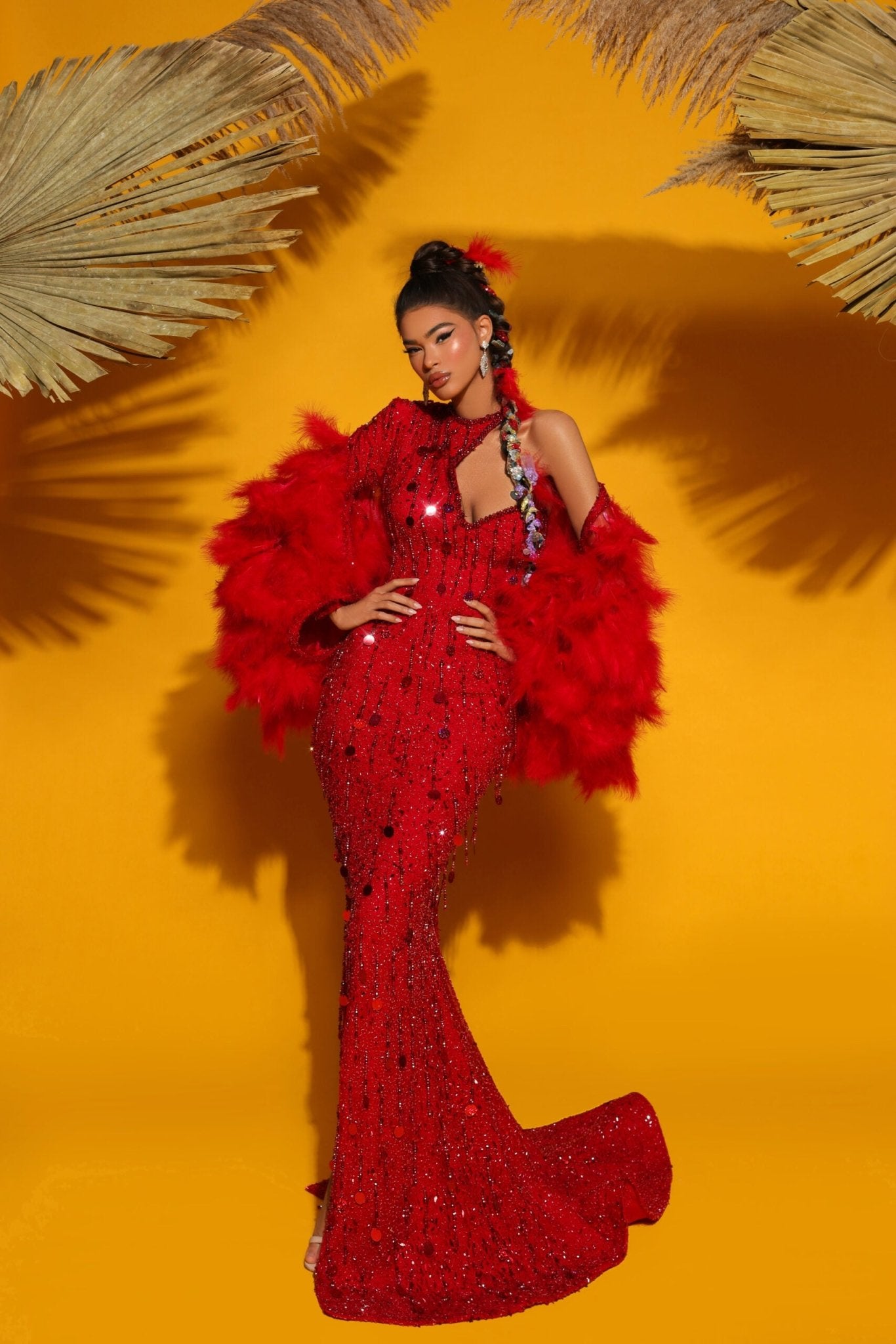 Cette longue robe rouge fera tourner les têtes avec ses sequins étincelants et ses plumes fluides. Les sequins rouges accrochent la lumière à chaque mouvement, ajoutant une touche de glamour et d'éclat à votre look. Les accents de plumes ajoutent une touche de fantaisie et de mouvement, ce qui rend cette robe parfaite pour une soirée spéciale. Les manches longues et le col haut ajoutent une touche de sophistication, tandis que la silhouette fluide est féminine et flatteuse. Que vous vous rendiez à un événement formel ou que vous vouliez simplement ajouter un peu d'éclat supplémentaire à votre garde-robe, cette robe rouge à sequins avec plumes ne manquera pas de faire sensation.