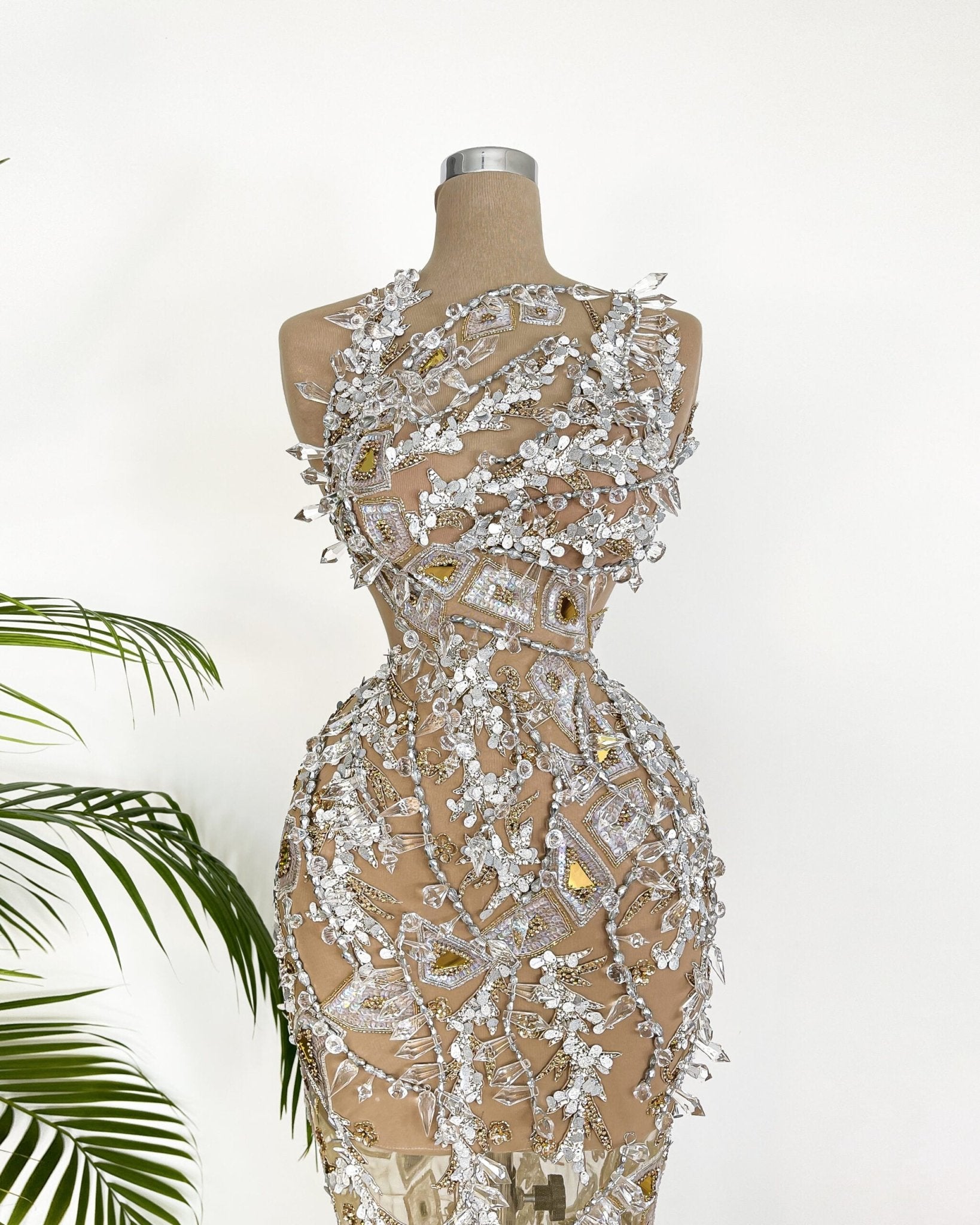 Cette robe sans manches à couper le souffle est ornée de pierres et de cristaux scintillants qui captent la lumière à chaque mouvement. Les pierres et les cristaux ajoutent une touche de glamour à la conception globale, ce qui en fait le choix parfait pour toute occasion spéciale. La robe est fabriquée à partir d'un tissu luxueux qui drape magnifiquement, avec une silhouette flatteuse qui flattera n'importe quelle silhouette. La coupe sans manches est cool et confortable, tandis que les pierres et les cristaux ajoutent une touche d'éclat. Que vous assistiez à un mariage, à un bal de promo ou à un événement formel, cette robe ne manquera pas de faire tourner les têtes et de vous faire sentir comme une vraie reine.