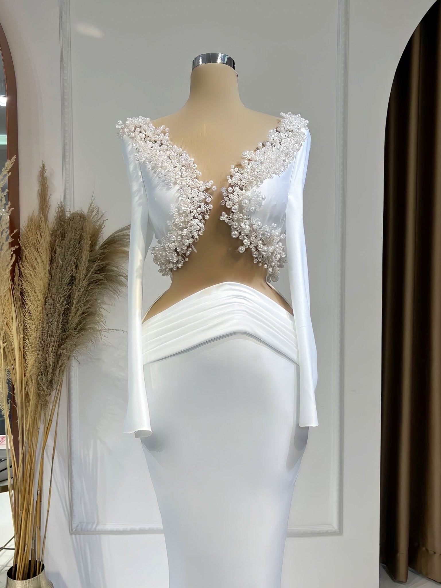 Cette robe de mariée à couper le souffle est un véritable chef-d'œuvre. Les manches longues bouffantes et la coupe profonde sur la poitrine respirent le glamour et la sophistication, tandis que l'embellissement intégral de pierres scintillantes, de perles délicates et d'étincelles scintillantes ajoute une touche de drame et d'opulence. Le corsage ajusté et la jupe évasée créent une silhouette classique à la fois intemporelle et féminine, et les pierres, les perles et les étincelles captent magnifiquement la lumière, créant un effet envoûtant. Que vous marchiez dans l'allée ou que vous posiez pour des photos, cette robe ne manquera pas de faire tourner les têtes et de vous faire sentir comme une vraie reine lors de votre journée spéciale.
