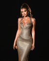 A striking high thigh slit adds drama and movement, revealing just the right amount of allure while elongating the legs for a statuesque effect. Flowing seamlessly to the floor, the dress creates a graceful, elongated line that exudes confidence and poise.