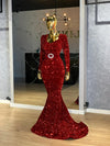 This long red dress is a show-stopping piece that is sure to turn heads wherever you go. The long sleeves and floor-length hemline add a touch of elegance, while the sequins add a pop of sparkle and glamour. The sequins catch the light beautifully, creating a mesmerizing effect as you move. The deep red color is rich and luxurious, making this dress perfect for formal events and special occasions. Whether you're attending a wedding, prom, or other formal event, this long red sequins dress is sure to make you stand out in the best way possible. The long sleeves and sequins also make this dress perfect for the winter months, keeping you warm and stylish at the same time. With its stunning combination of red, sequins, and long sleeves, this dress is a must-have for any fashion-forward wardrobe.
