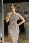 This long dress exudes luxury and elegance with its flashy stones and shiny silver embellishments. The dress is covered in shimmering silver embellishments that catch the light beautifully, creating a dazzling effect. The stones are thoughtfully placed to add just the right amount of sparkle and shine to the dress, giving it a truly glamorous feel. The silver embellishments are perfectly coordinated with the dress and give it a cohesive and striking look that is sure to make you feel like a star. The dress is perfect for any formal occasion, such as a gala, wedding or prom, and is sure to make a lasting impression. With this dress, you will shine, sparkle and make a statement in any event, it will make you look and feel fabulous.