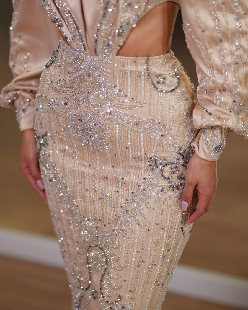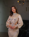 This breathtaking long dress is a true showstopper. The high neck and long puff sleeves add a sophisticated and feminine touch to the overall look, while the stone embellishments add a touch of glamour and glam. The entire dress is adorned with sparkling stones that catch the light and add a touch of luxury to the overall look. The long length of the dress adds a touch of drama and elegance, while the high neck and puff sleeves give it a formal, sophisticated vibe. Whether you're attending a wedding, prom, or other formal event, this dress is sure to make you feel confident and stylish. The stone embellishments give it a modern and stylish edge, making it perfect for any special occasion.