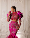 The two-piece long dress in pink color is the epitome of elegance and grace. With its high neck and long sleeves, the dress exudes sophistication and femininity. The dress is all embellished with sparkling stones and delicate beads that catch the light beautifully and add a touch of glamour to the overall look. The attention to detail in the embellishments is impressive, making sure that no part of the dress is left unnoticed. The feather mermaid hemline gives the dress a touch of whimsy, adding a playful element to the overall design. The long length of the dress creates a stunning silhouette, making it a perfect choice for a formal occasion. Whether you're attending a wedding, a gala, or any other black-tie event, this dress is sure to turn heads and leave a lasting impression.