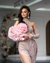 Elegance takes center stage with this enchanting Pink Dress crafted from luxurious light pink lace, a testament to refined sophistication. Additionally, every inch of the gown is adorned with glistening crystals, casting a mesmerizing sparkle that captures attention effortlessly. Furthermore, the asymmetrical neckline adds a contemporary twist to its timeless charm, featuring a high neck that exudes grace.