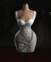 The corseted waist transitions seamlessly into a figure-hugging, crystal-embellished mini skirt. Intricate beadwork and sequin patterns radiate from the center, creating a mesmerizing, starburst effect. The shimmering silver hues give the dress a celestial glow, making it appear as if woven from stardust. Each bead and sequin is meticulously placed to enhance the natural curves of the body, sculpting an ultra-feminine silhouette.
