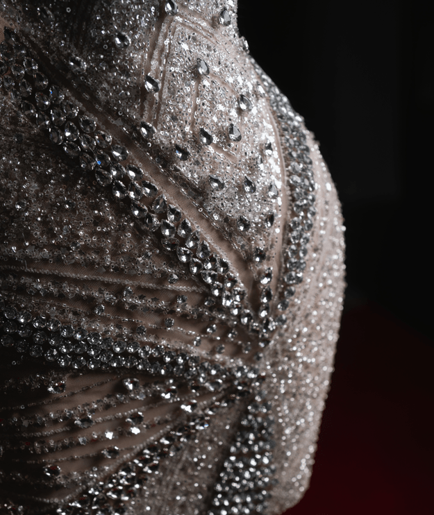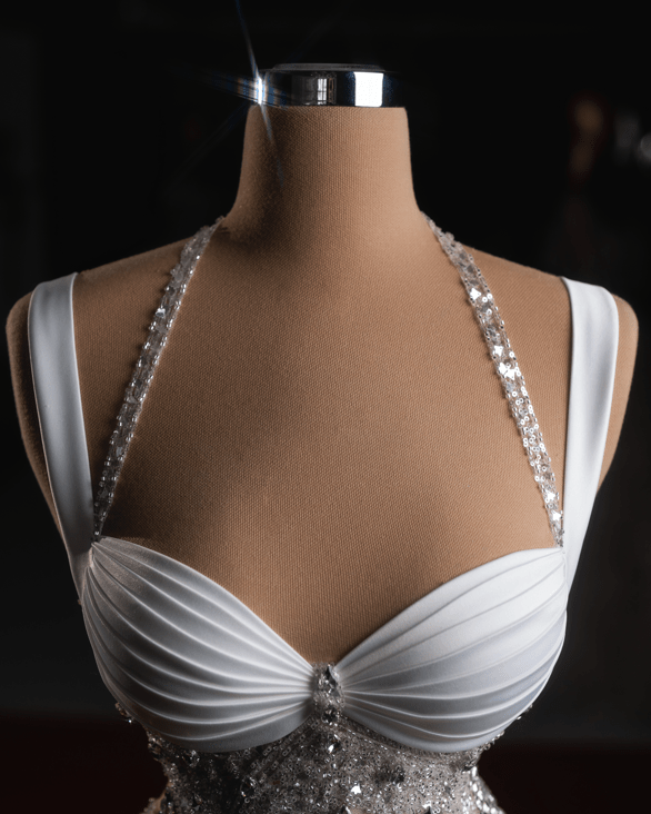 This exquisite dress is a dazzling blend of sensuality and sophistication, designed to captivate with its intricate embellishments and sculpted silhouette. The bodice features a structured, pleated white satin bust with a sweetheart neckline, exuding a vintage Hollywood allure. The halter-style straps, encrusted with shimmering crystals, elegantly frame the shoulders and décolletage, adding an element of refined glamour.