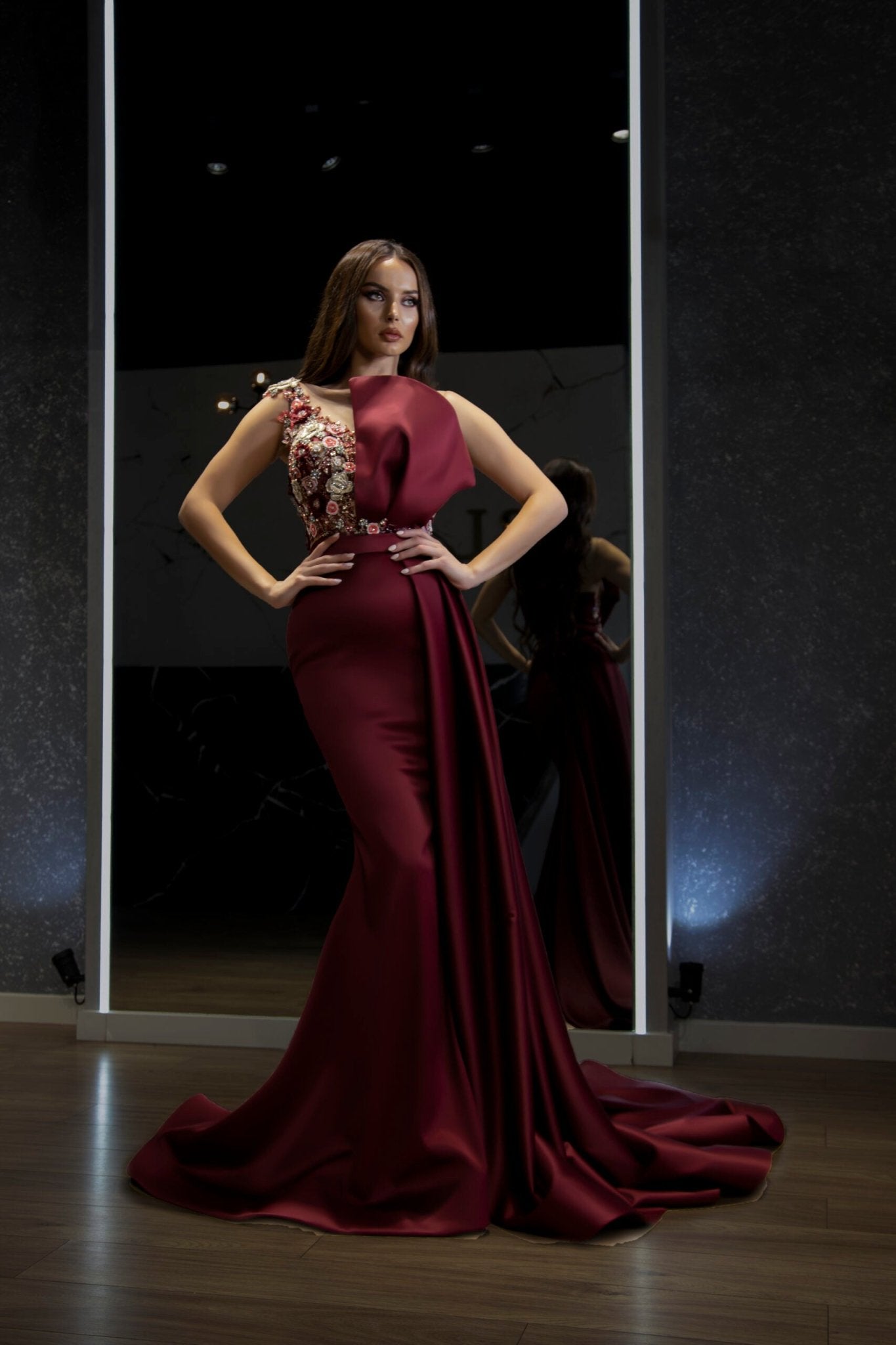 This breathtaking ruby red satin dress is the epitome of glamour and sophistication. The long, flowing silhouette of the dress is accented by the bold and vibrant ruby red color, which is sure to turn heads and make a statement. The dress is adorned with intricate details of floral lace, adding a touch of romance and femininity to the overall design. The ruby red color is bold and striking, and the satin material gives the dress a glossy finish that is sure to make you stand out in a crowd. Whether you're attending a black tie gala or a fancy dinner party, this dress is sure to make you feel like the belle of the ball. Pair this dress with your favorite heels and accessories for a look that is both elegant and unforgettable.
