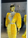 This stunning yellow long velvet dress is the perfect choice for any woman looking to make a bold fashion statement. The bright, sunny yellow color is cheerful and vibrant, and the velvet fabric adds a touch of luxury and sophistication. The dress is embellished with flashy crystals that add a touch of glamour and sparkle, making it perfect for any special occasion. The long puff sleeves and figure-hugging silhouette create a feminine and flattering look that will have you feeling confident and fashionable. The rich, luxurious fabric drapes beautifully over the body, creating a sleek and sophisticated silhouette. Whether you're attending a formal event or simply want to add a pop of color to your everyday look, this yellow velvet dress is sure to turn heads wherever you go. The combination of the rich fabric, bold color, and sparkling accents make this dress a true showstopper.