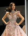 The entire dress is encrusted with an array of different size of stones and crystals, the bodice is decorated with shimmering crystals that catch the light beautifully and create a dazzling effect, the skirt is adorned with stones that flow and grace in every movement. The back of the dress also features a subtle yet elegant crystal embellished design that adds to the overall allure of the dress.