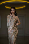 This long dress exudes sophisticated elegance with its one-shoulder design. The dress features a sleek, figure-hugging silhouette that flatters the body's natural shape. The dress is adorned with intricate gold detailing that adds a touch of luxe and glamour to the overall look. The silver shiny tassels embellishments adds a graceful and flowing movement as you walk. The combination of gold and silver colors creates a perfect harmony and making the dress perfect for any formal event or special occasion. This dress is the perfect blend of elegance, simplicity, and style that will make you feel confident and stunning.