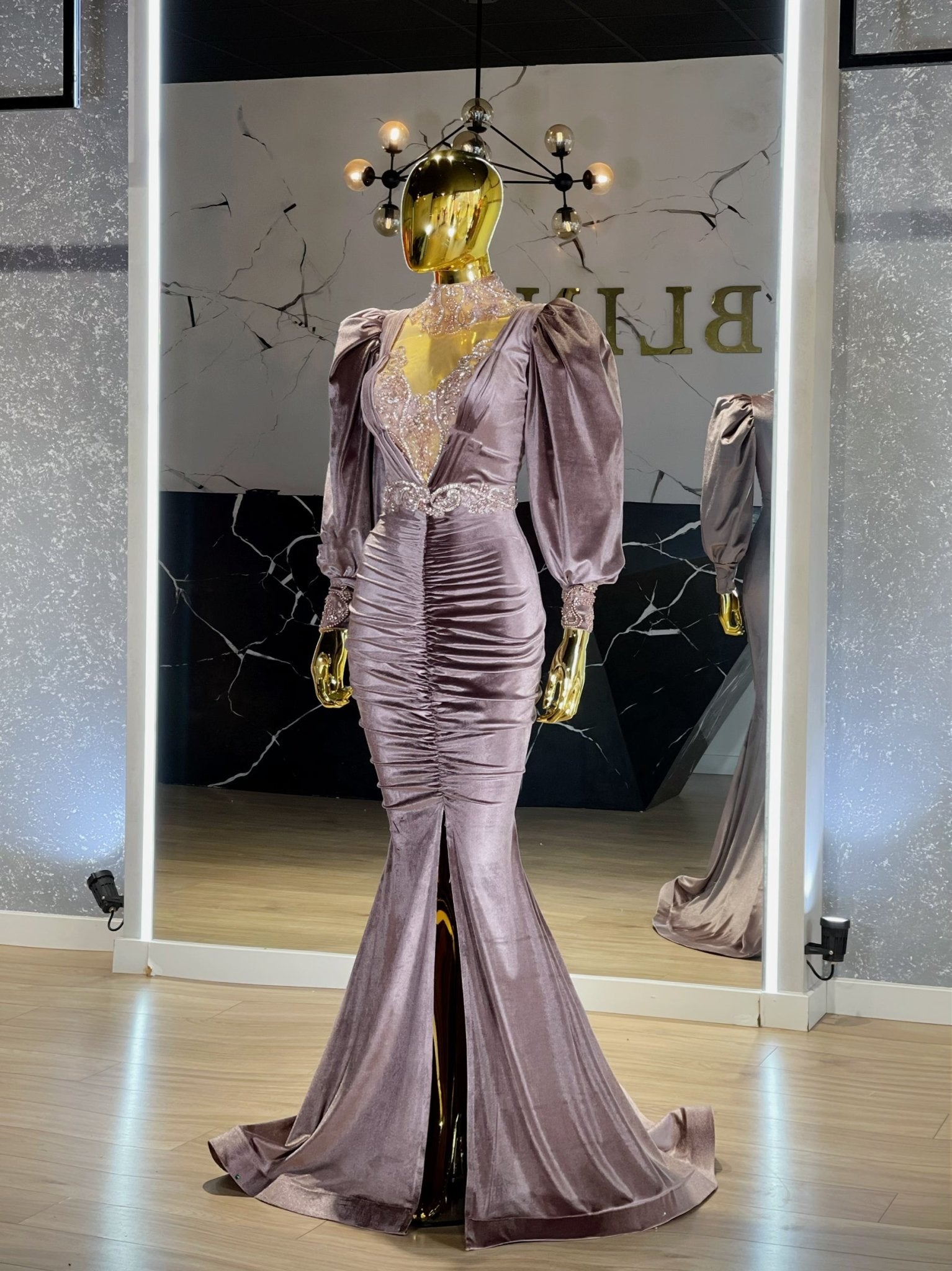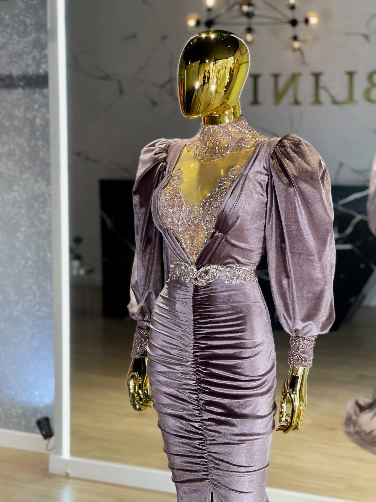 This luxurious long velvet dress is the epitome of sophistication and glamour. The rich velvet fabric is adorned with sparkling stones, adding a touch of sparkle and shine to the overall look. The long puff sleeves bring a playful and feminine touch to the dress, while the long length ensures a sleek and elegant silhouette. The high quality craftsmanship of the dress is evident in every detail, from the expertly placed stones to the carefully tailored sleeves. This velvet and stone dress is the perfect choice for any formal occasion, whether you're attending a black tie event or a fancy dinner party. Either way, this velvet and stone dress is sure to make a lasting impression.