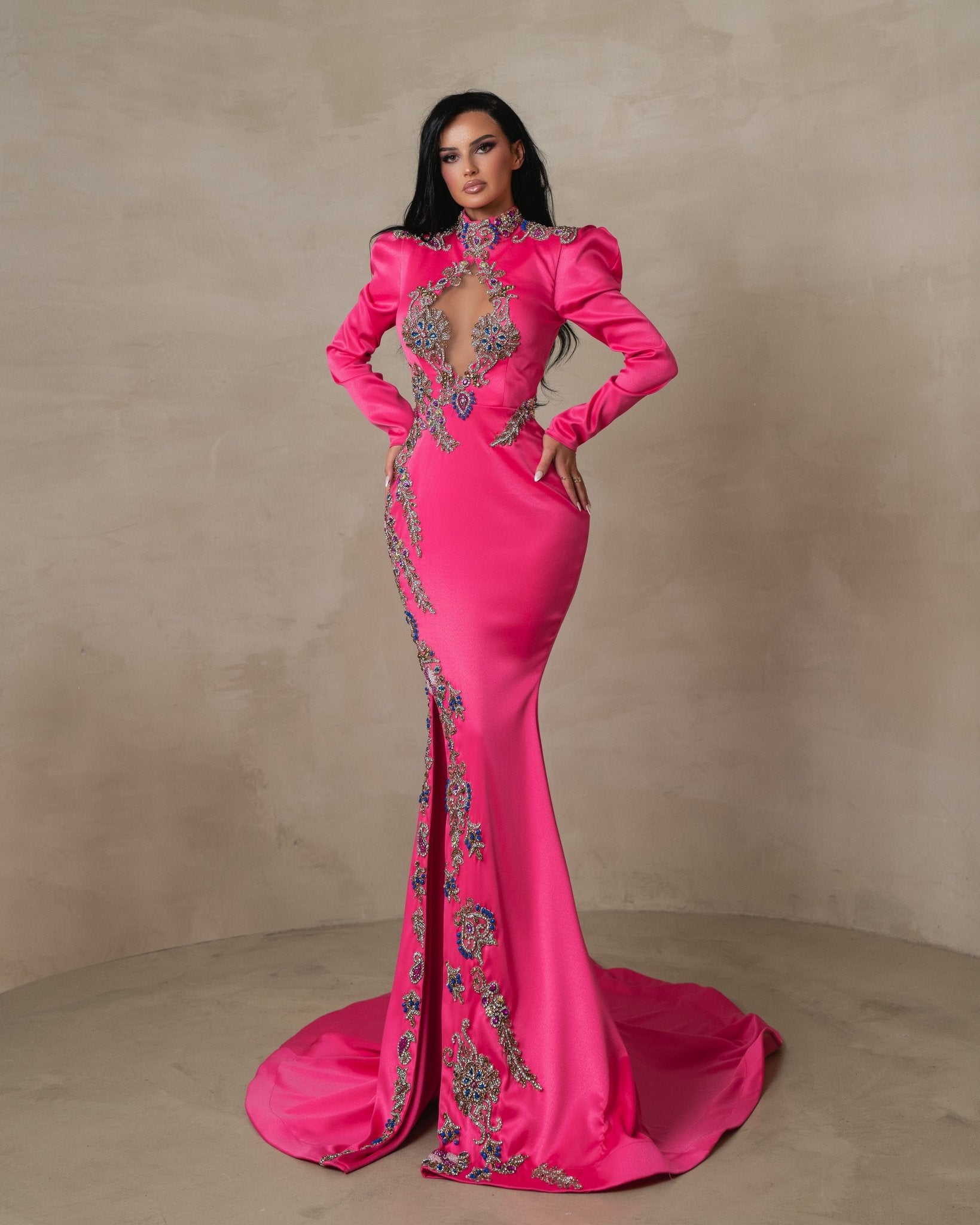 Aerithia Hot Pink Long Sleeve Satin Dress with Leg Slit