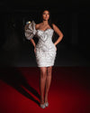 The dress features a sweetheart neckline that beautifully frames the décolletage, complemented by a fitted bodice that sculpts and enhances the figure. Adding a dramatic touch is the one-shoulder design, adorned with a statement floral embellishment. This sculptural detail, meticulously crafted, becomes the focal point of the dress, exuding artistic elegance and charm.
