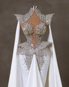Furthermore, an ethereal touch is added with the side capes, gracefully flowing from the shoulders to the floor. The matching white satin capes add a touch of whimsy, creating an aura of enchantment as the bride moves. The entire bodice of the Bridal Dress is a canvas of dazzling brilliance, adorned with meticulously placed crystals.