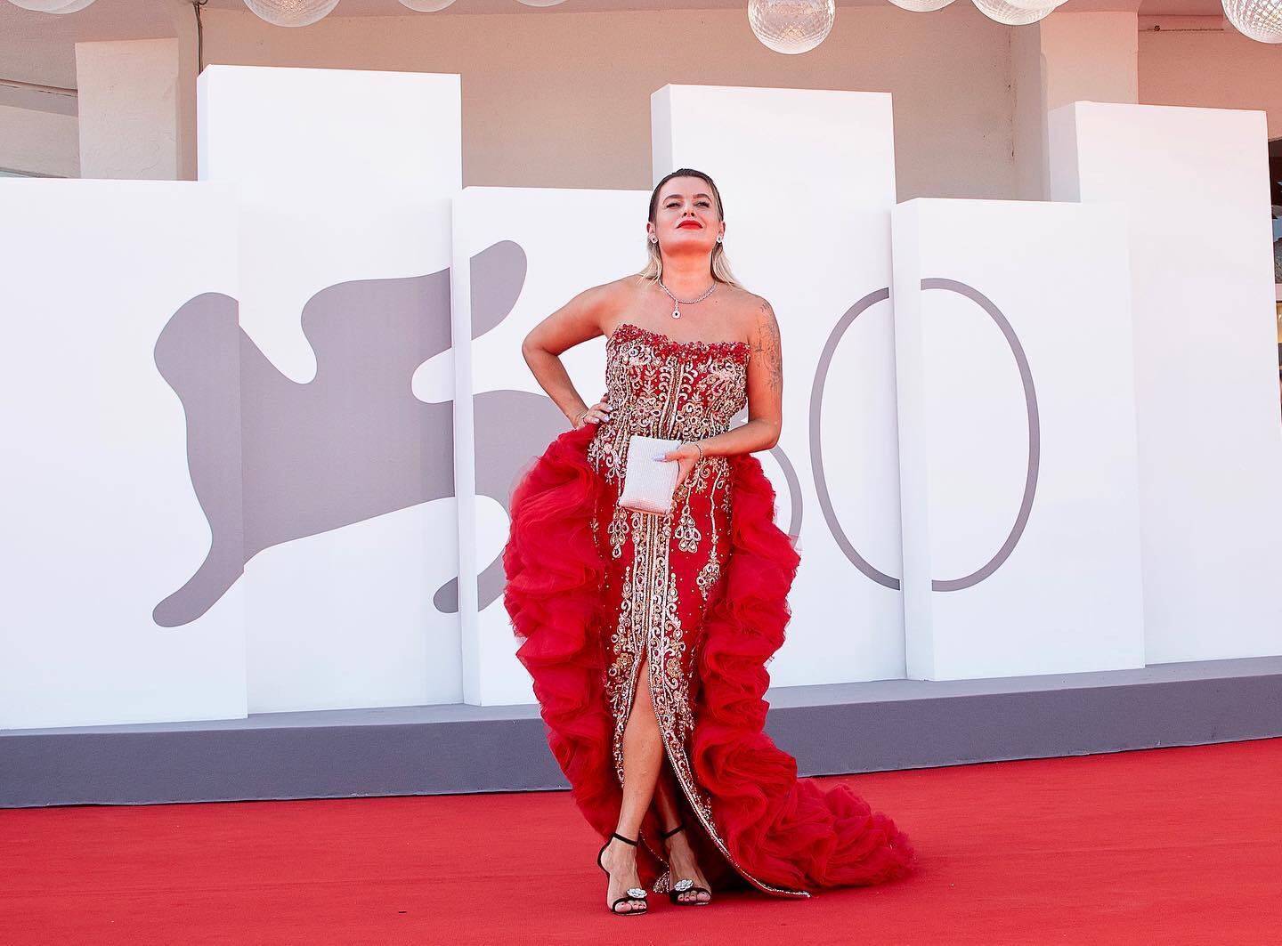 Experience the allure of the 80th Venice Film Festival with the dress that stole the spotlight – the exquisite red gown worn by the enchanting Anna Stukkert. This sleeveless masterpiece, crafted with meticulous attention to detail, is a true embodiment of luxury and glamour.
